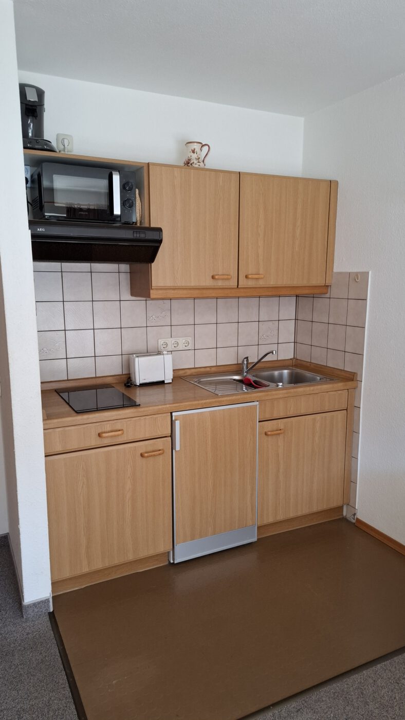 Der Wohnbereich ist ideal gestaltet und beinhaltet ein gemütliches Sofa, welches zu einem Schlafsofa ausgezogen werden kann, einen Esstisch, eine voll ausgestattete Küchenzeile mit einem 2-Platten-Ceranfeld, Mikrowelle, Kaffeemaschine, Toaster, Wasserkocher und Kühlschrank mit Gefrierfach.