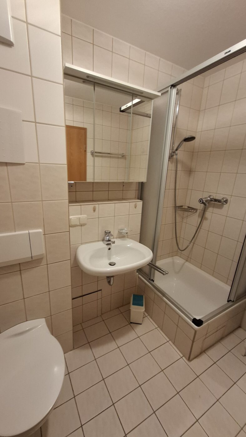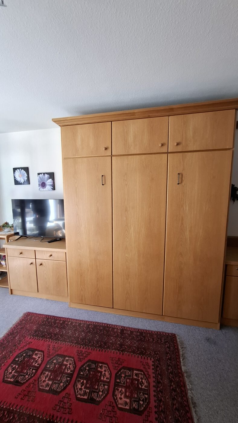 Das Doppelbett ist clever in einer Vollholzschrankwand versteckt, die ausreichend Stauraum bietet und den Kleiderschrank gleich mit integriert. Der Flur ermöglicht Aufbewahrungsmöglichkeiten für Jacken und Schuhe. Das Bad hat eine Duschkabine, WC und einen großen Spiegelschrank.
